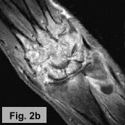 IMAGING FINDINGS: A triple-phase bone scan was obtained on AIC's dual-head nuclear camera. Fig. 1a-c show the angiographic (flow) images, blood pool images, and delayed (static) images of the wrists, respectively. They demonstrate marked increased uptake in the left wrist in all 3 phases of the study. Fig. 2a-b are selective pre and post-contrast MRI images of the left wrist showing precontrast T1-weighted (Fig. 1a) and postcontrast T1-weighted with Fat SAT (Fig. 1b). They demonstrate diffuse edema in the marrow of all the carpal bones and proximal metacarpal bones with diffuse enhancement of the marrow and surrounding synovium. X-rays (not shown) revealed diffuse osteopenia and erosions of the carpal bones.