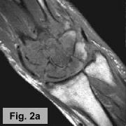 IMAGING FINDINGS: A triple-phase bone scan was obtained on AIC's dual-head nuclear camera. Fig. 1a-c show the angiographic (flow) images, blood pool images, and delayed (static) images of the wrists, respectively. They demonstrate marked increased uptake in the left wrist in all 3 phases of the study. Fig. 2a-b are selective pre and post-contrast MRI images of the left wrist showing precontrast T1-weighted (Fig. 1a) and postcontrast T1-weighted with Fat SAT (Fig. 1b). They demonstrate diffuse edema in the marrow of all the carpal bones and proximal metacarpal bones with diffuse enhancement of the marrow and surrounding synovium. X-rays (not shown) revealed diffuse osteopenia and erosions of the carpal bones.