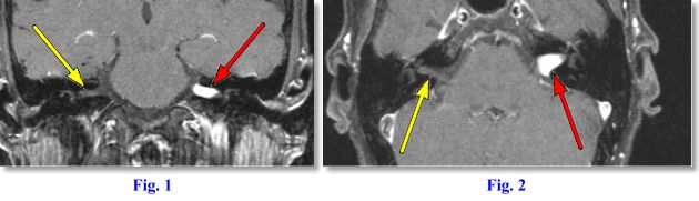 MRI Findings: Figs. 1 and Fig. 2 are thin (2 mm) post-contrast T1 weighted Fat Saturated (fat turns dark) images through the IAC’s performed on AIC’s ultrafast, high-resolution, high-field Siemens Symphony magnet. Fig. 1 is a coronal and Fig. 2 an axial image. They demonstrate a bright enhancing mass in the left cerebellopontine angle (CPA) extending into the left IAC (red arrows). A normal right IAC can be seen (white arrows).