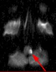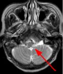 MRI Findings: In the supratentorial regions, some atrophy and chronic small vessel deep white matter ischemic changes were observed (Fig. 1) but no acute lesion or infarct was observed on MR diffusion. In the posterior fossa, however, a subtle small 1 cm hyperintensity can be seen in the left side of medulla on T2 weighted (Fig. 2) and FLAIR images (Fig. 3). This can be seen with an infarct, but its age would remain indeterminate. The MR diffusion image (Fig. 4) shows hyperintensity in the same region consistent with an acute infarct (arrows) as opposed to chronic ischemic changes.