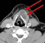HELICAL CT FINDINGS: The CT scan was performed on AIC’s Multi-slice, Multi-detector Helical CT Scanner with 2.7 mm axial sections at 2.5 mm intervals before and during infusion of low-osmolar, non-ionic contrast using a power injector. It shows a lobulated cystic mass (arrows) in the neck at and below the hyoid bone in the midline and to the left of it, with portions of it behind the hyoid bone and portions embedded in the left strap muscle.